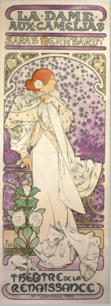 Mucha captures the tradgedy of the tale with shocking impact. The grief-stricken heroine leans wearily against a balustrade and is flanked by a background of silver stars. In her hair is a white camelia. Another camelia, this time symbolising death, is held up by a hand at the bottom of the poster. This smooth-stemmed plant contrasts with the thorny roses piercing the hearts at the top of the design, evoking the play’s principal theme – love’s ultimate sacrifice.